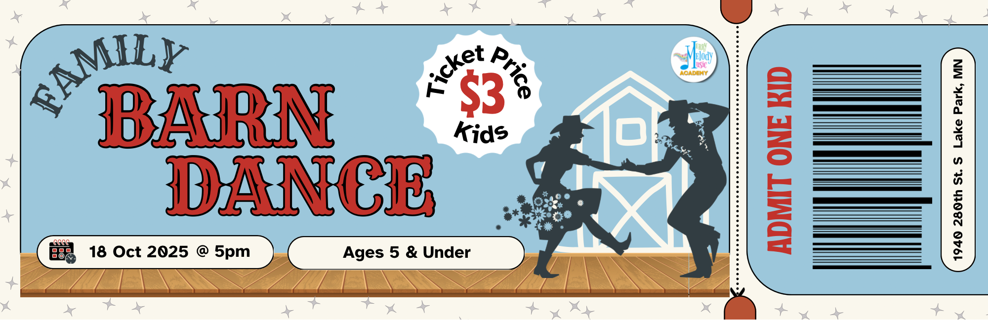 Categories: Select a Category Family Barn Dance Film Premiere Family Barn Dance Quick View Kid Barn Dance Ticket Sale Price: $3.00 Original Price: $5.00 Sale Add To Cart Added! Quick View Youth Barn Dance Ticket Sale Price: $8.00 Original Price: $10.00 Sale Add To Cart Added! Quick View Senior Barn Dance Ticket Sale Price: $6.00 Original Price: $8.00 Sale Add To Cart Added! Quick View Adult Barn Dance Ticket Sale Price: $10.00 Original Price: $12.00 Sale Add To Cart Added!